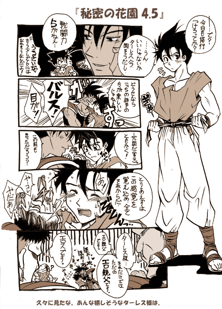 鈴影 涼さまから頂きましたーーー!!! 棚からぼた餅!濡れ手に粟!とはこういうことをいうんですね!! 四コマ目の悟飯から流れ出るエロスに窒息死しそうです。萌えで。 そりゃあターレスもエロ親父になるよ!当然ですよ!必然ですよ! ターレスは確実に、あの顔が見たくて修行を増やしていると思います。 ちらりとふとももがのぞく服装も最高です。あんな格好で街を歩けば、怪しい大人も引っ掛かるというものです(具体例:レタス) 可哀相なのはむしろターレスより、愉快な仲間たちのほうですね! 鈴影さま、本当にありがとうございましたー!! |